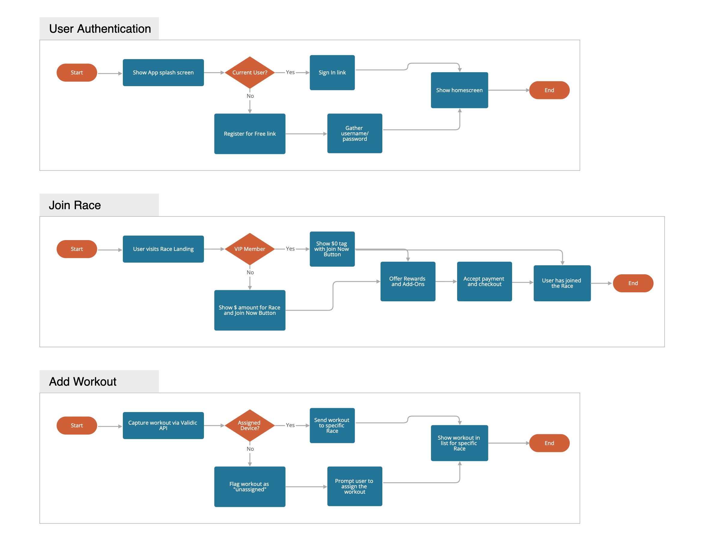 It was extremely important to nail down the customer flow from initial sign up/sign in, to joining a race, and adding a workout. The 3 key areas of our platform that users perform the most.